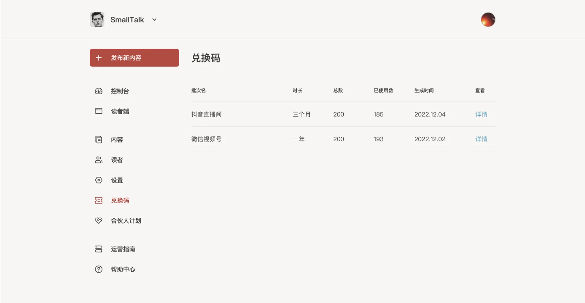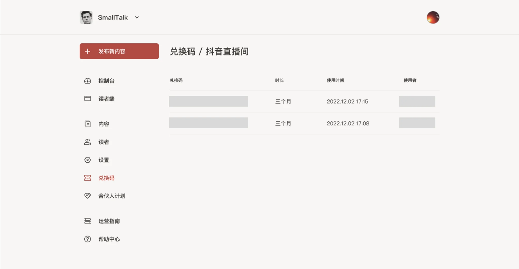在创作者后台左侧左侧菜单中,你可以找到「兑换码」的管理入口。